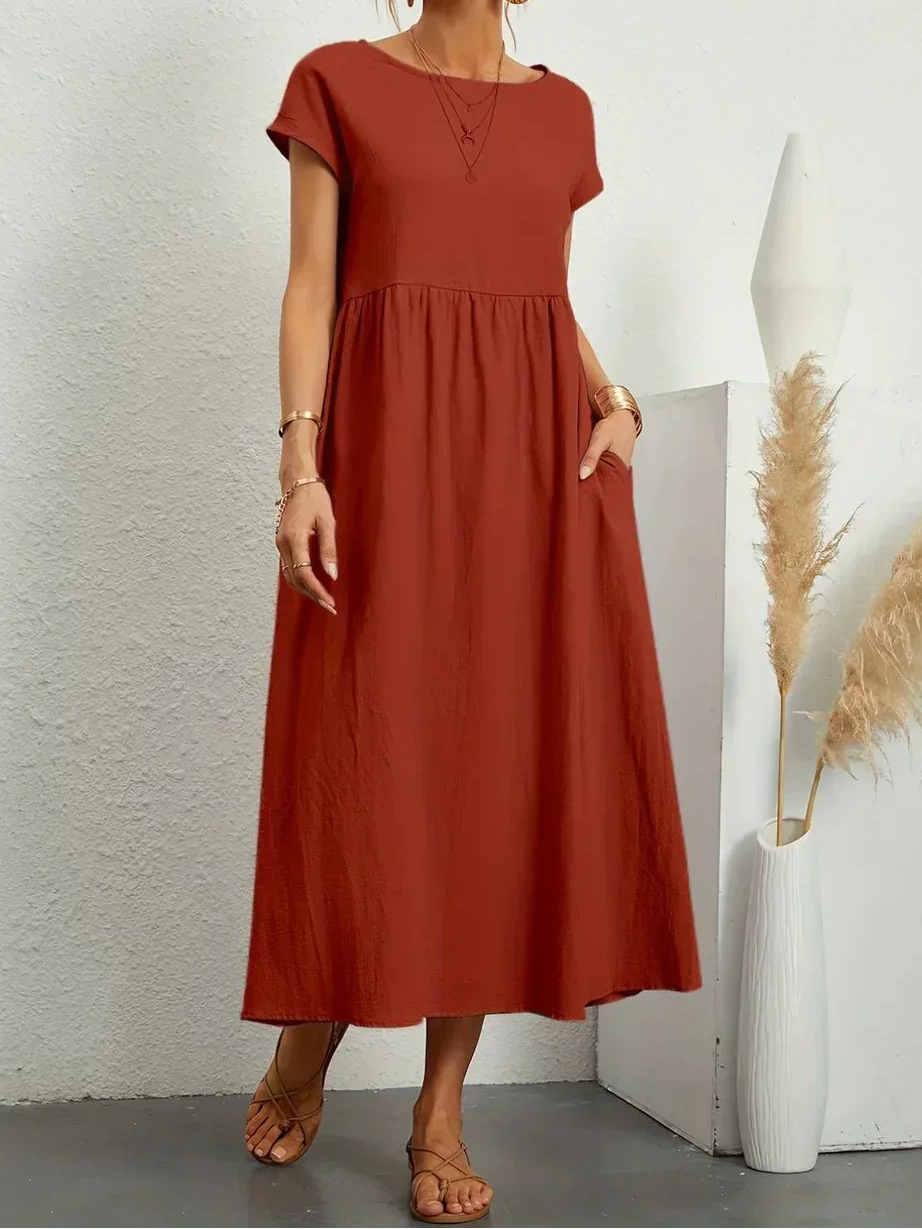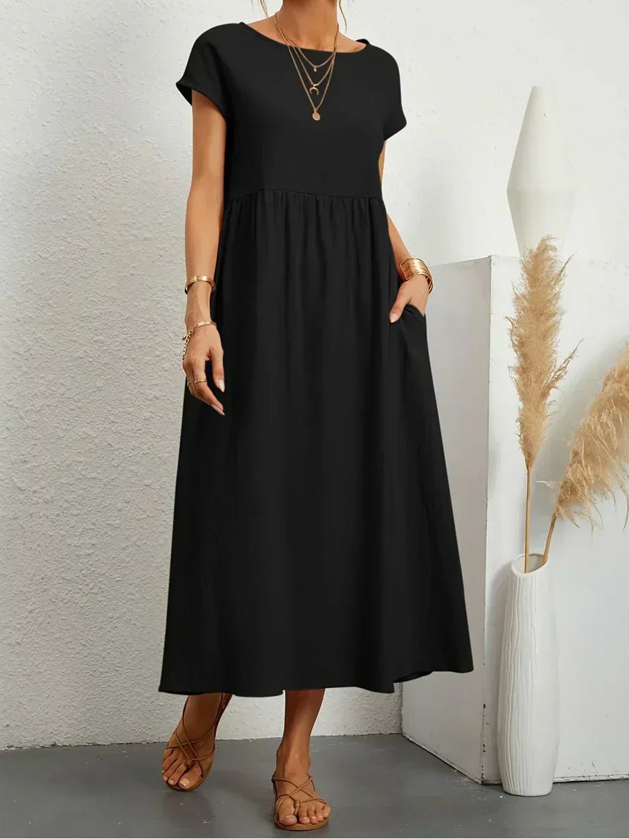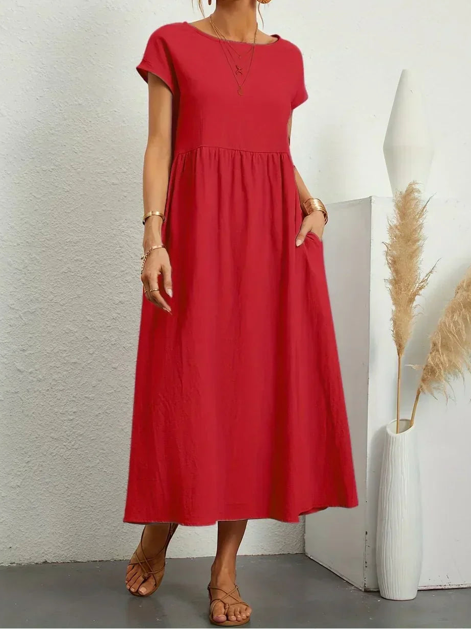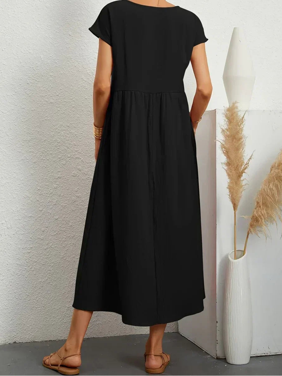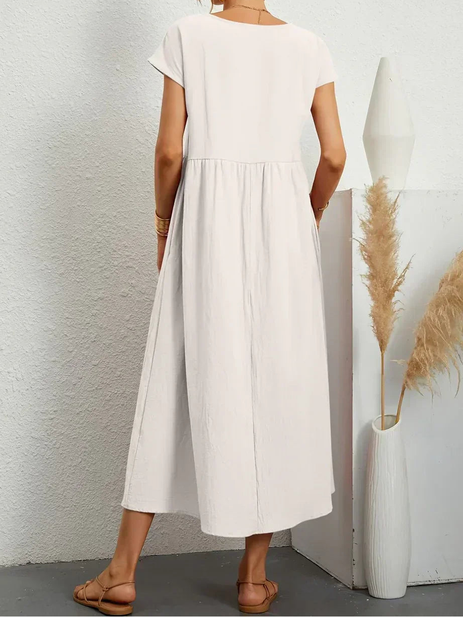 Spüre die Freiheit und feminine Leichtigkeit mit Anna. Dieses entspannte Midikleid vereint Komfort mit eleganter Lässigkeit – perfekt für Sommer-Spaziergänge, Treffen mit Freunden oder Urlaubsabenteuer.