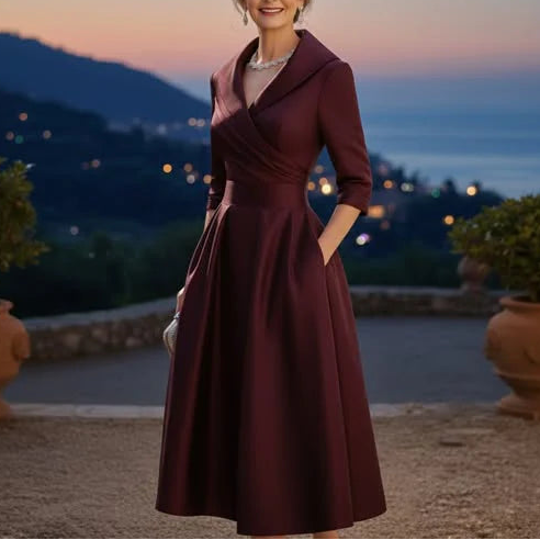 Ein eleganter V-Ausschnitt, der nicht zu tief ist, Falten, die an der richtigen Stelle fallen, 3/4-Ärmel, die diskret bedecken, und ein Stoff, der keine Shapewear oder „Eindrücken“ des Bauches erfordert.